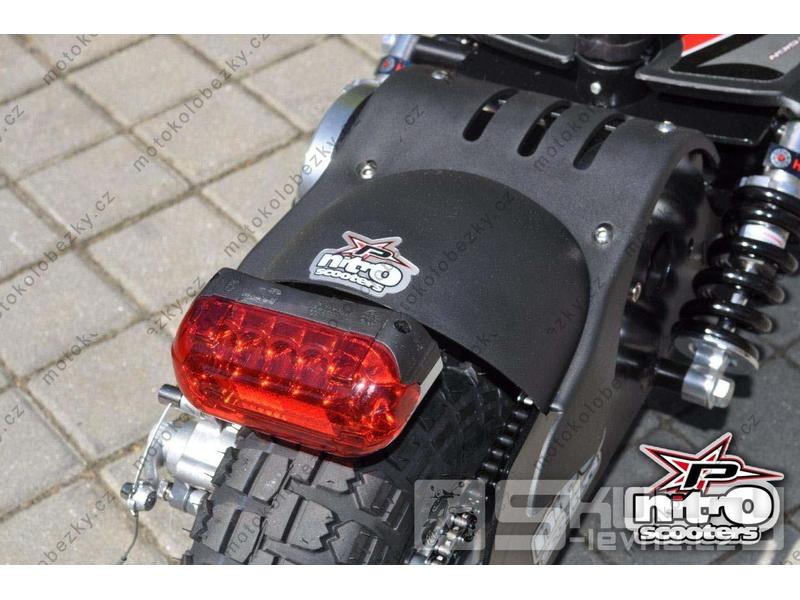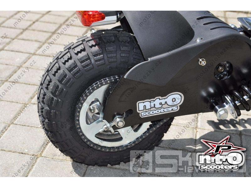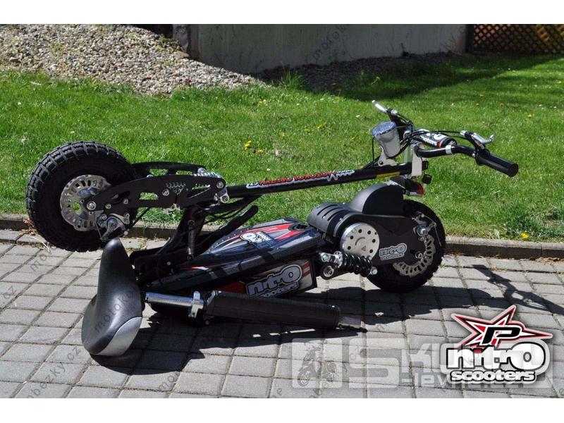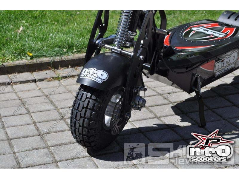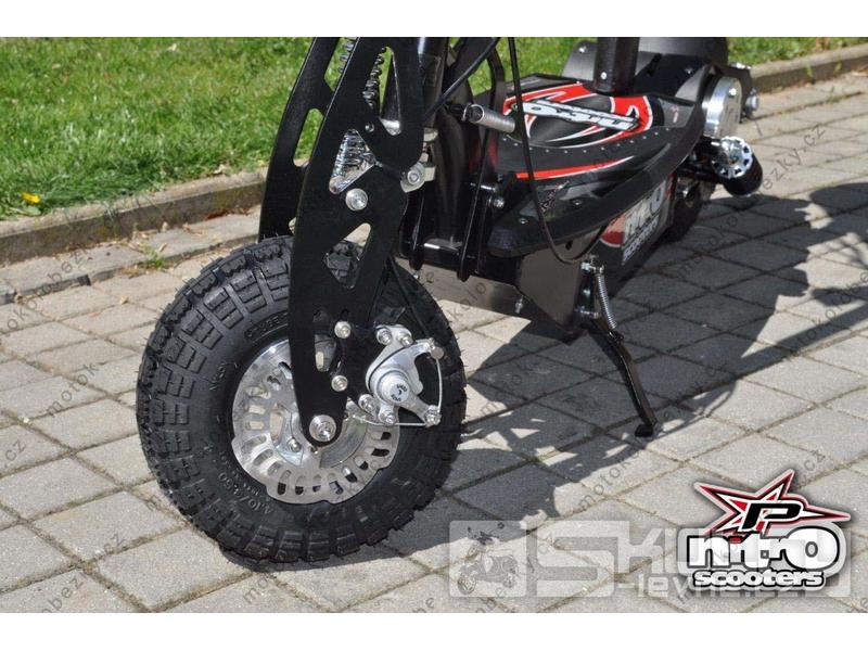 Tento model je vybaven jak předním tak zadním odpružením. Přední odpružení je převzato z benzínových modelů, je stabilnější a odolnější než-li staré provedení. Jsou použity masivní bočnice, které v kombinaci s novou přední pružinou zajišťují bezpečný provoz stroje. Přední vahadlové pružení funguje nově na principu uložení v ložiskách - tzn. minimální potřebu dotahování jistících šroubů, lehký chod pružení! Tuto inovací nabízí pouze značka Nitro scooters!!!