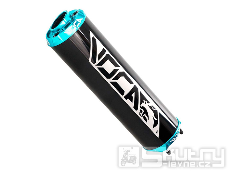 VOCA tlumič výfuku je vybaven CNC obráběnou hliníkovou koncovkou a eloxovaným hliníkovým tělem v černé barvě s koncovkou v odstínu světle modrá/tyrkysová. Díky kompaktní délce pouhých 220 mm a zesílenému vnitřnímu prostoru nabízí vysokou odolnost i při extrémních teplotách. Koncovka je upevněna třemi černými nerezovými šrouby, což zajišťuje pevnost a dlouhou životnost.