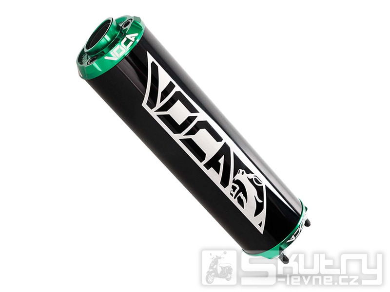 VOCA tlumič výfuku je vybaven CNC obráběnou hliníkovou koncovkou a eloxovaným hliníkovým tělem v černé barvě s koncovkou v zelené barvě. Díky kompaktní délce pouhých 220 mm a zesílenému vnitřnímu prostoru nabízí vysokou odolnost i při extrémních teplotách. Koncovka je upevněna třemi černými nerezovými šrouby, což zajišťuje pevnost a dlouhou životnost.
