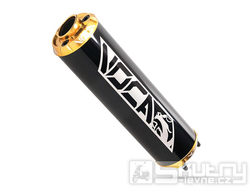 VOCA tlumič výfuku je vybaven CNC obráběnou hliníkovou koncovkou a eloxovaným hliníkovým tělem v černé barvě s koncovkou ve zlaté barvě. Díky kompaktní délce pouhých 220 mm a zesílenému vnitřnímu prostoru nabízí vysokou odolnost i při extrémních teplotách. Koncovka je upevněna třemi černými nerezovými šrouby, což zajišťuje pevnost a dlouhou životnost.