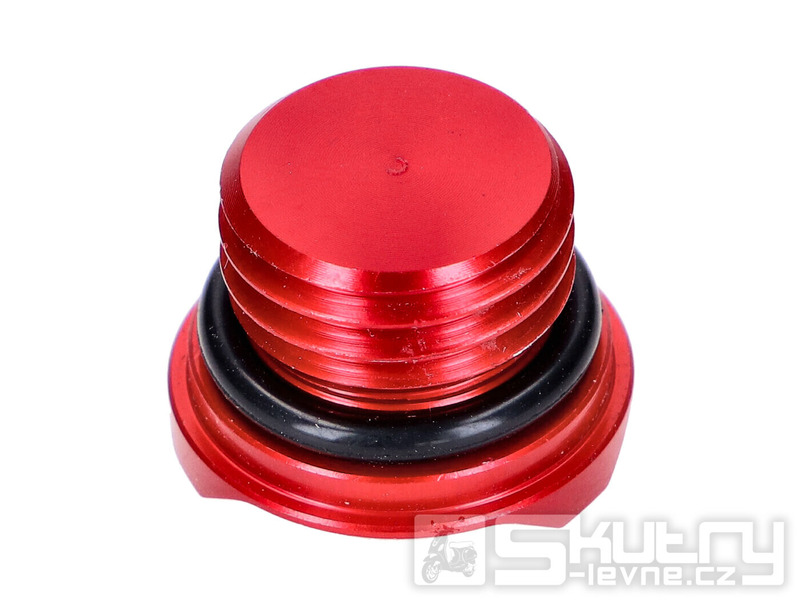 Červená CNC olejová zátka VOCA pro motocykly s řazením s motorem Minarelli AM nebo pro asijské repliky mopedů značek Generic, KSR‑Moto, Keeway, Motobi, Ride (typy motorů 1E40MA, 1E40MB).