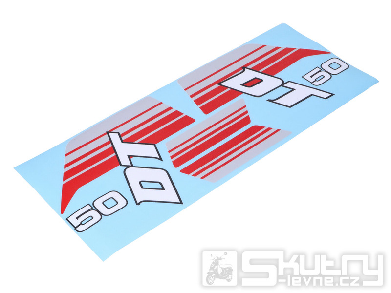 Sada kvalitních samolepek na nádrž určená pro model Yamaha DT 50 z let 1983–1985. Barevná kombinace červená / šedá / bílá perfektně ladí s černými mopedy a vrací stroji původní, autentický vzhled.