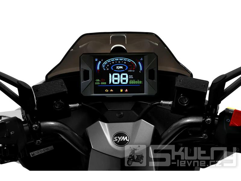 Nový 5palcový barevný LCD přístrojový panel přináší přehledné zobrazení všech klíčových informací, které jezdec potřebuje během jízdy. Zobrazuje údaje běžné u vyšších modelů SYM – otáčky motoru, čas, napětí baterie, teplotu chladicí kapaliny, stav paliva, indikaci bočního stojanu i počítadla kilometrů.