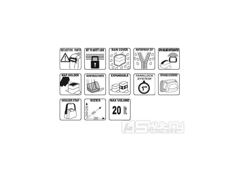 Rychloupínací rozšiřovací tankruksak na enduro o objemu 20 litrů v rozměru šířka x výška x hloubka 208 x 200-230 x 350mm vybaven slídou na mapu, popruhem přes rameno a pláštěnkou v reflexní barvě.