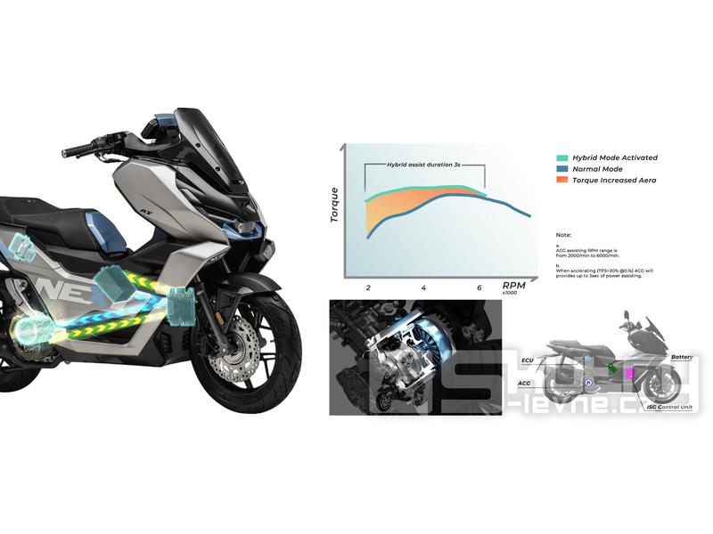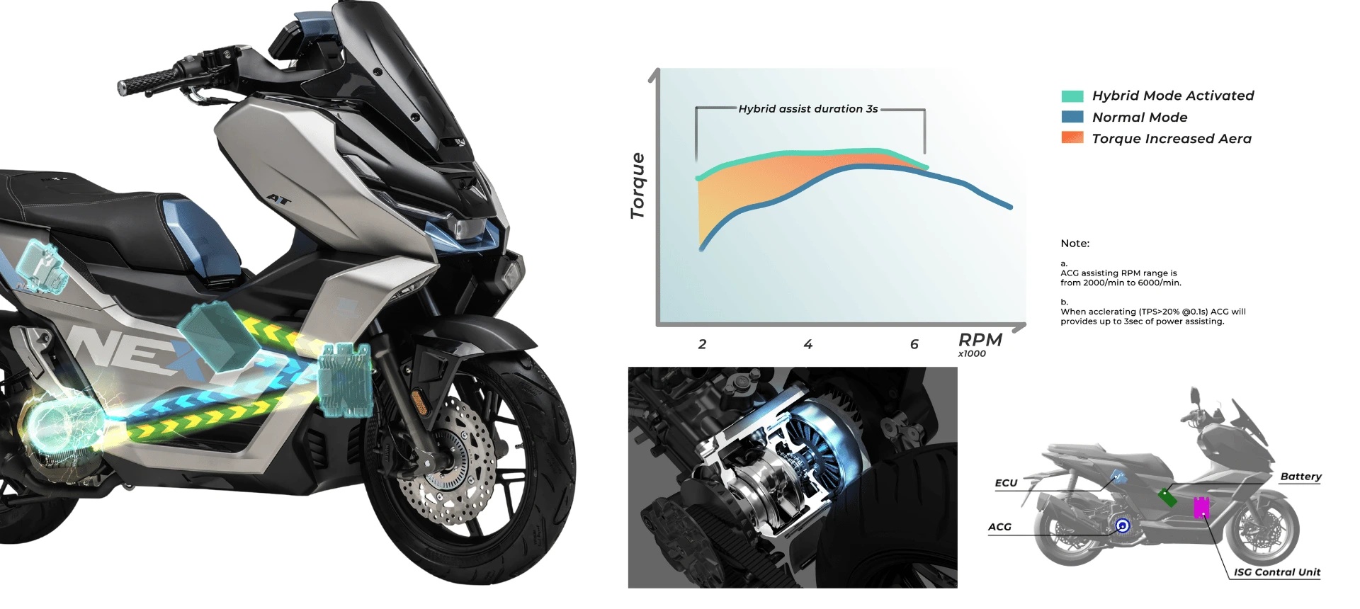 Skútr obsahuje lithiovou baterii 12V48Wh (Li-ion, zn. SKYRICH), skútr nejezdí na elektromotor, pouze ACG pomáhá při startování (zajišťuje tiché a plynulé startování motoru) a asistuje při otáčkách 2000 – 6000 ot./min. (viz. obrázek).