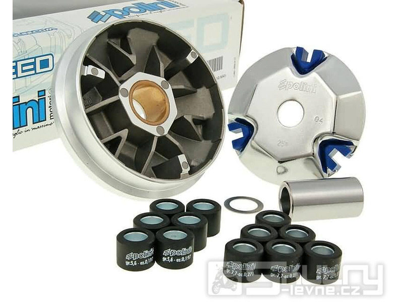 Polini Hi‑Speed variátor nabízí ideální kombinaci výrazně lepší akcelerace z nízkých otáček a zvýšené maximální rychlosti. Tento osvědčený variátor je precizně zpracovaný a dodávaný jako kompletní sada, takže jej lze okamžitě namontovat a začít využívat jeho výhody. Součástí balení jsou dvě sady variátorových válečků (5,6 g a 7,7 g), tři vodítka a čep variátoru.